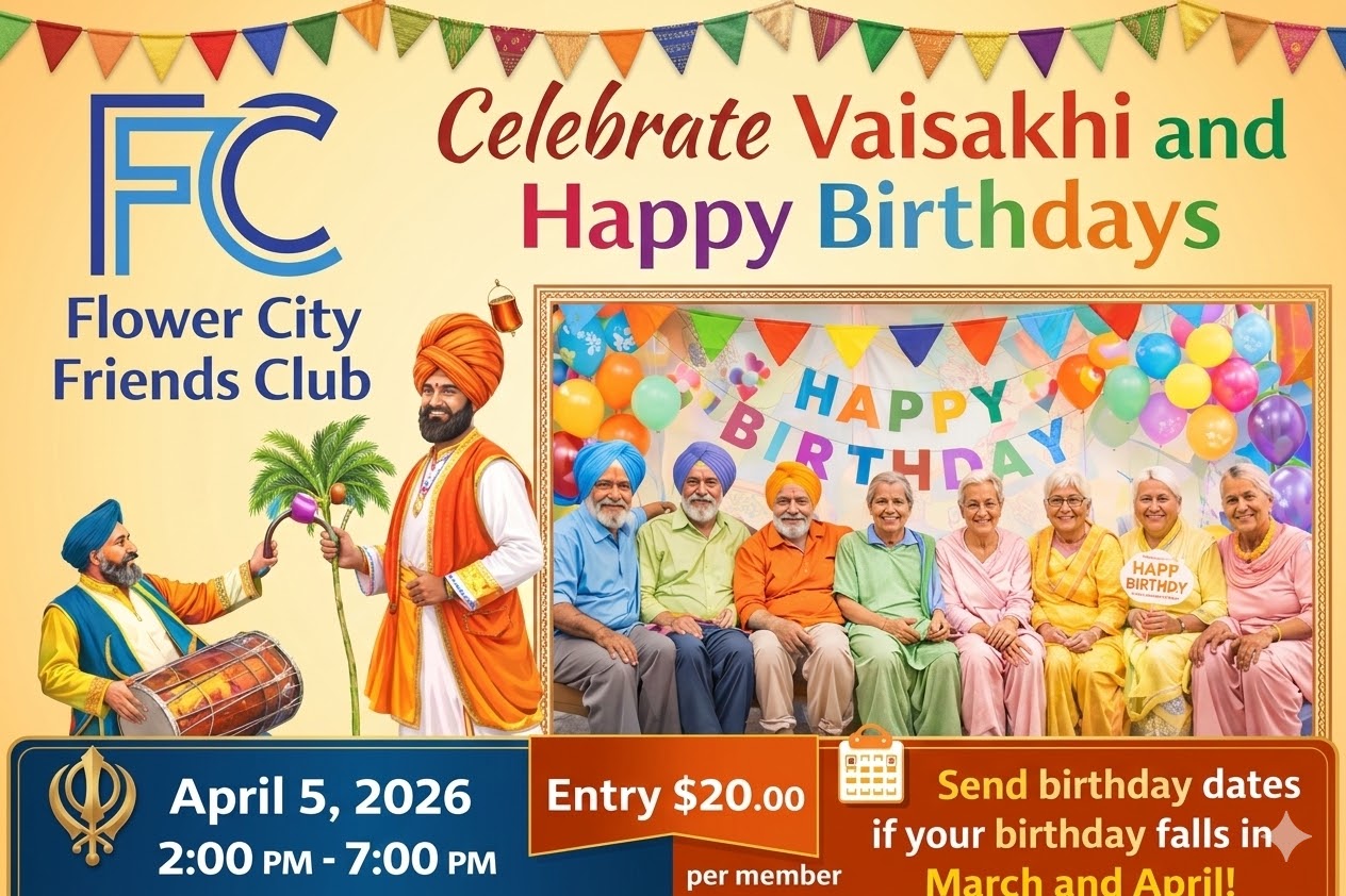 Flower City Friends Club is excited to invite you to join us for a joyful and vibrant celebration of Vaisakhi — a festival of harvest, happiness, and new beginnings.